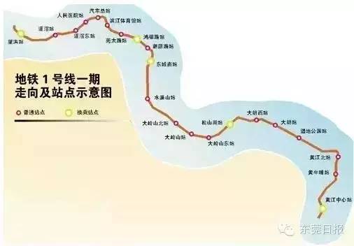 (东莞地铁1号线走向及站点示意图)